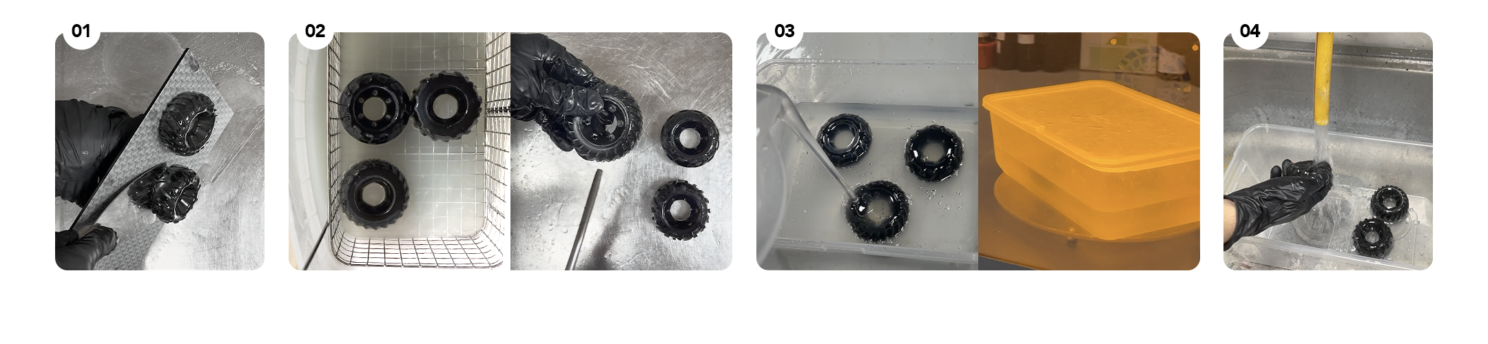 1. 以清水洗淨固化完成的模型。2. 清洗後放置於陰涼、通風的室內環境陰乾。3. 如果需要再增加抗撕裂與回彈等表現,可再加熱 80°C 烘烤 2 小時。(請參考上面規格)。